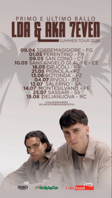 Per LDA e Aka 7even sarà un'estate all'insegna della musica. Dopo la partecipazione al Festival di Sanremo e l'instore tour, il loro sodalizio è più saldo che mai: i due colleghi e amici hanno annunciato il "Primo e Ultimo Ballo - Summer Tour 2026", il nuovo tour estivo. La serie di live sarà inaugurata proprio domani (giovedì 9 aprile) con una data a Torremaggiore, in provincia di Foggia, dopodiché si estenderà tra i mesi di maggio e luglio. Qui tutte le date.