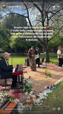 Pochi giorni fa, dopo il suo ritorno sui social, Sangiovanni aveva annunciato un live gratuito dedicato a tutti i suoi fan, che si è tenuto ieri (2) in una location segreta a Roma, che è stata comunicata solo a chi ha partecipato e che ora sappiamo essere il giardino di Ripa Grande, nel cuore di Trastevere. I fortunatissimi che sono riusciti ad aggiudicarsi un posto al gran ritorno di Sangio dal vivo hanno potuto assistere a uno show all'aperto unico, dove l'artista si è esibito accompagnato da una band.