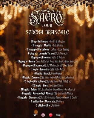 La prima parte della tournée si svolgerà in Europa: Londra, Madrid e Barcellona. Poi, dall’estate, i concerti si sposteranno in Italia, con due tappe nella regione dell’artista, ovvero la Puglia. Gli appuntamenti a casa sono in programma il 31 luglio a Ostuni e il 3 ottobre a Bari, la sua città.