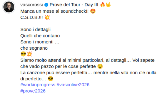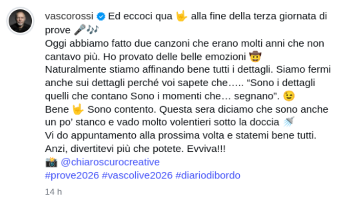 Vasco Rossi sta dando costanti aggiornamenti tramite le sue pagine social: “Abbiamo fatto due canzoni che erano molti anni che non cantavo più. Ho provato delle belle emozioni”. Ha anche anticipato che la scaletta sarà “imprevedibile, irraggiungibile, inarrivabile, inequivocabile, ineludibile, straordinaria e stupefacente”.